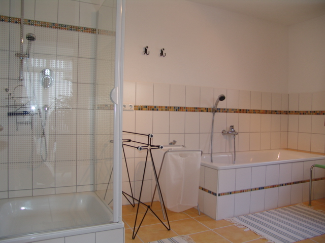 ein wunderschönes Bad mit Fußbodenheizung, Dusche und Badewanne sowie ein heller, moderner Wohnraum